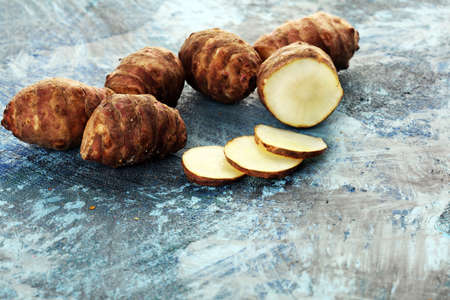 Jerusalem artichoke and slices on rustic background. Fresh raw organic vegetable plant