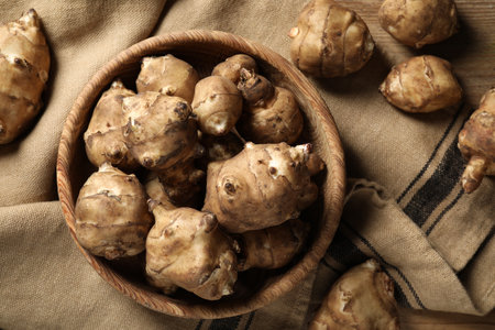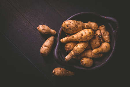Jerusalem artichoke roots in a bowl on wooden table. Top view of fresh raw topinambour potato on rustic background
