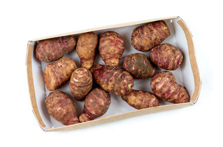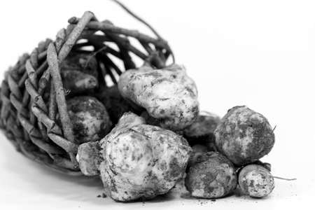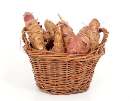 Jersalem Artichoke (Helianthus tuberosus) vegetable in wicker basket isolated on a white studio background.