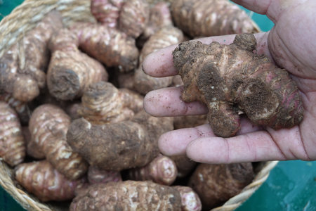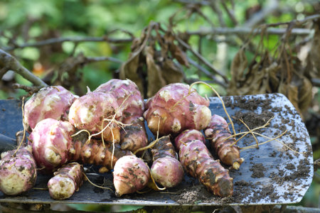 Jerusalem artichoke tubers, also known as sunchokes, are lying on a garden shovel after being freshly harvested from the soil, showing their raw and edible root vegetable form