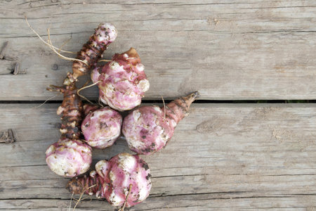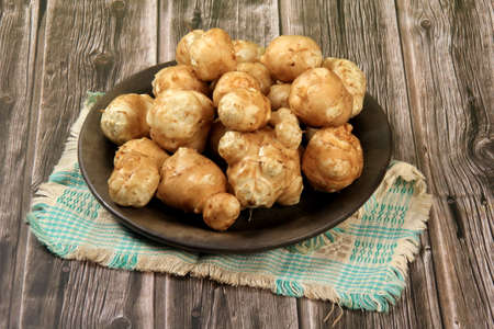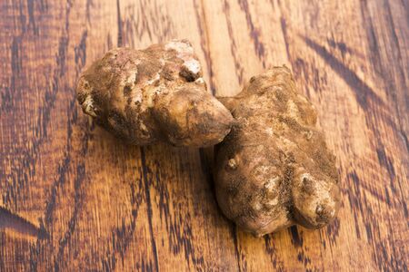 Jerusalem artichokes are showcasing freshly harvested edible tubers, also known as topinambur or sunchokes, displaying their unique shape and earthy texture on a rustic wooden surface