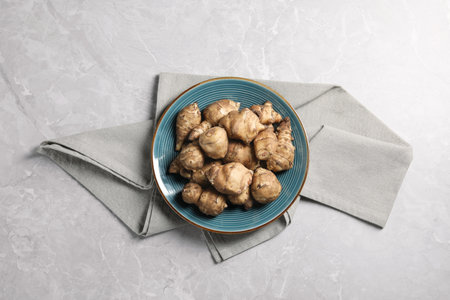 Raw Jerusalem artichoke on a gray linen cotton napkin. Jerusalem artichoke solar root, earthen pear.