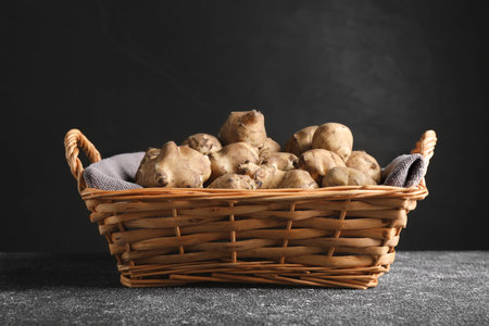 Wicker basket with many Jerusalem artichokes against dark background, closeup