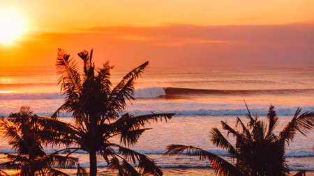 Sunset or sunrise with biggest ocean waves for surfing and coconut palms