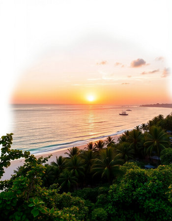 Aerial view of a tropical beach with palm trees during a stunning sunset on a sunny day
