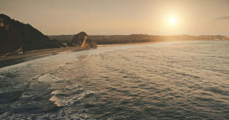 Sun set seascape of ocean gulf roch shore aerial view. Beautiful nature landscape of tropical isle at summer evening. Epic scenery of Indonesia vacation at Sumba island. Cinematic sunset drone shot
