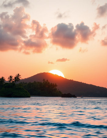 A breathtaking view from the surface of the ocean looking at a vibrant sunset between a rocky cliff and a tropical island with silhouetted palm trees.