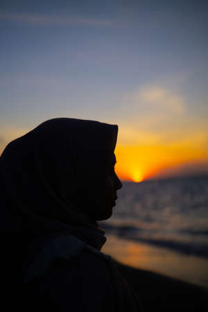Silhouette of muslim woman wearing hijab at sunset on the beach