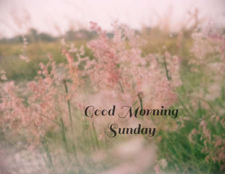 Happy Sunday typography text with alarm clock and flower decoration on wooden background