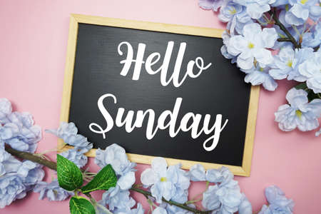 Hello Sunday text on wooden blackboard and flower decoration on pink background
