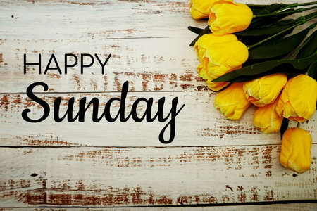 Happy Sunday text and Bouquet of yellow tulips on white wooden background
