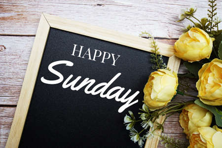 Happy Sunday text on blackground decorated with flower bouquet on wooden background