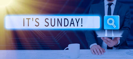 Writing displaying text It S Is Sunday. Business overview Day of rest and religious worship Part of the weekend Man With Tablet Showing A Search Bar And Exploring Crucial Information.