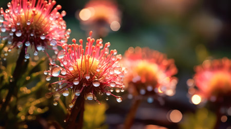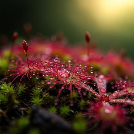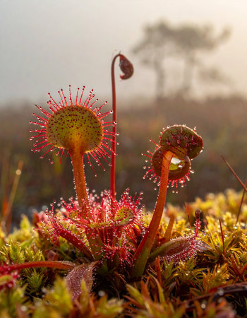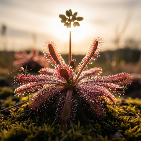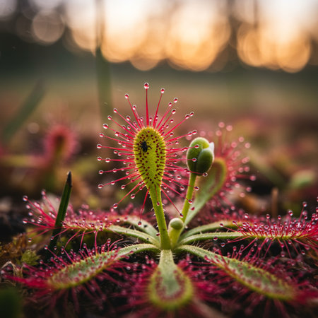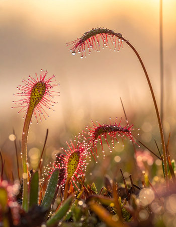 Bathed in the warm, golden light of a misty sunrise, delicate carnivorous sundew plants awaken.