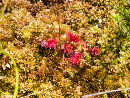 Round-leaved sundew, Drosera rotundifolia, in peatmoss, Sundew, or dew plant, or lustwort, in a small carnivorous, or insectivorous, swamp plant that catch insects, with sticky drops on its leaves.