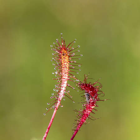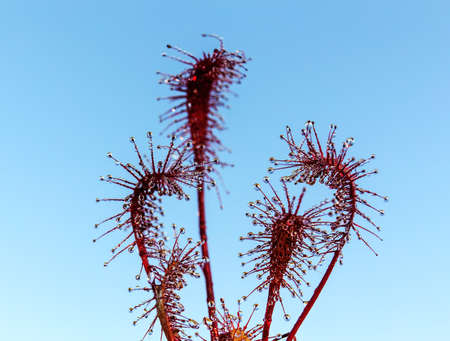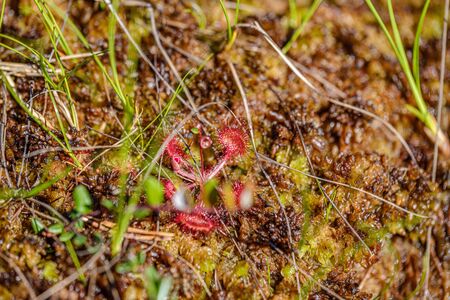 A beautiful sundew growing in the wetlands. Sundew plant leaves waiting for insects. Carnivorous plant in Northern Europe.
