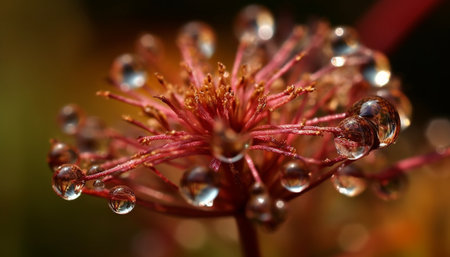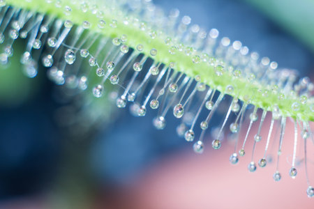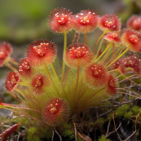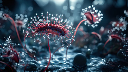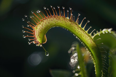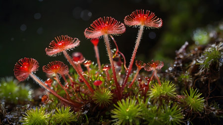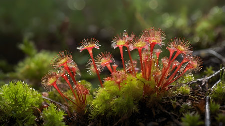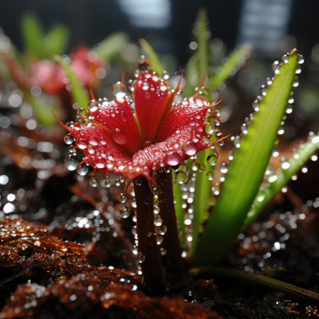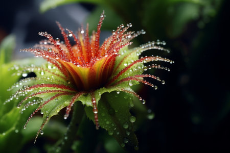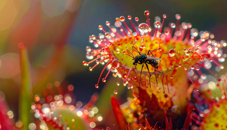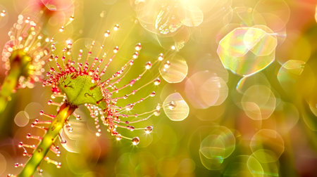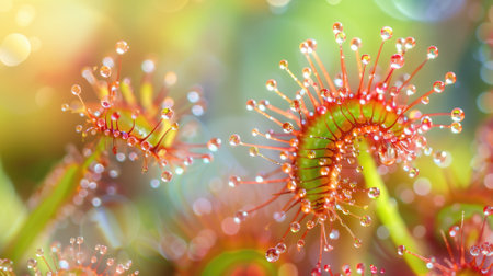 Dewdrops glisten on a vibrant sundew plant, nature's carnivore