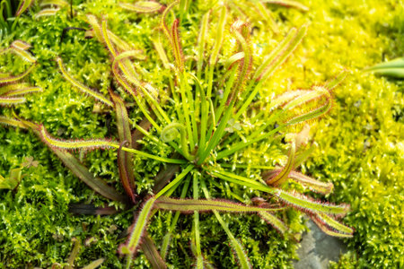 Drosera carnivorous plants with sticky leaves grow on lush green moss in the Singapore Botanic Gardens under natural tropical light