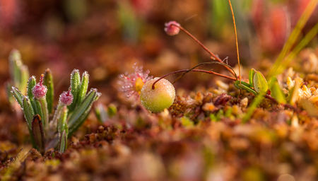 Round-leaved sundew in moss macro, selective focus, shallow DOF