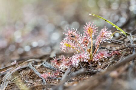 A beautiful round leaved sundew in a marsh after the rain. Shallow depth of field closeup macro photo.