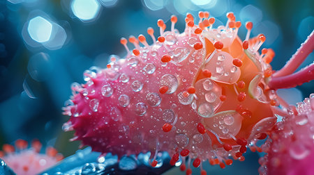 A stunning close-up of a flower with dewy petals, featuring water droplets and a soft bokeh background. This image captures the beauty of nature.