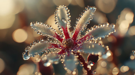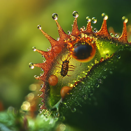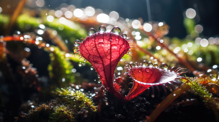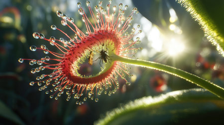 A captivating close-up of a dewy carnivorous plant, showcasing intricate details of sunlight glistening on drops of water and insects caught in its trap.