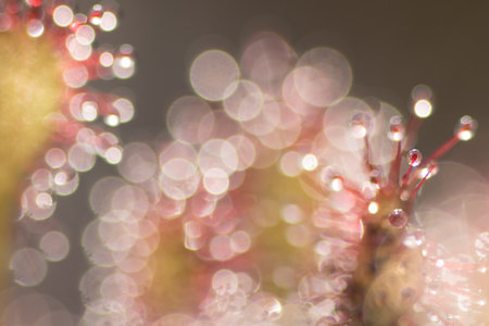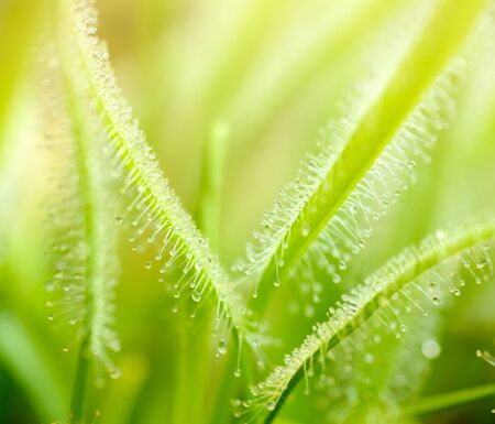 Macro photo of sundew, insectivorous plants. Which has the scientific name Drosera. Indicate the abundance of nature.