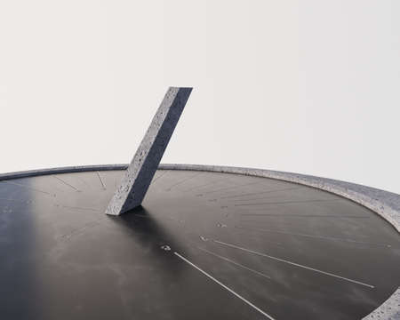 A 3D render of a sleek modern sundial clock made of stone with white markings on an isolated white studio background