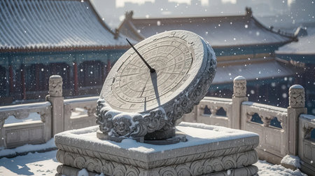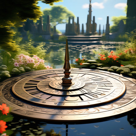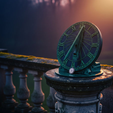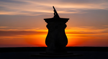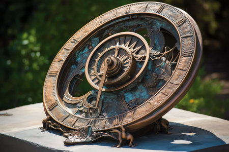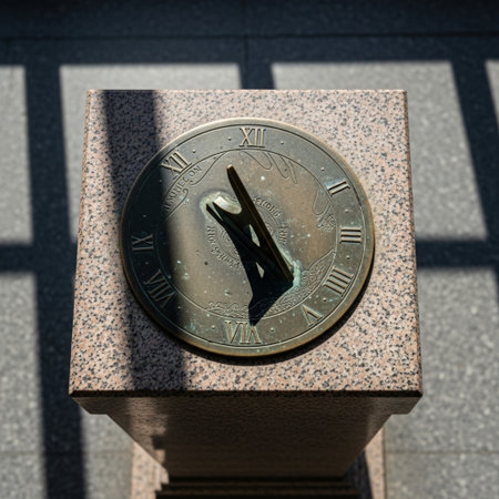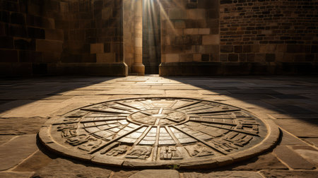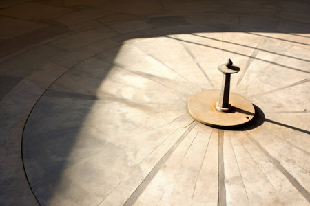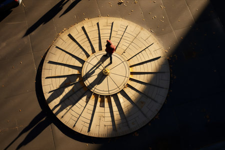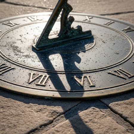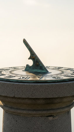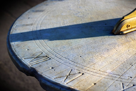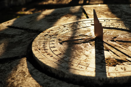 Ancient sundial displays moving shadows, illustrating the passage of time. set in a historical setting with rugged stone textures, the image evokes a sense of antiquity and continuity, capturing the essence of time's relentless flow.
