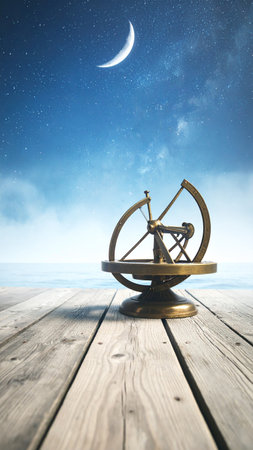 Photorealistic vintage sextant placed against a glowing star-filled night sky over calm ocean, soft reflections on water, no human presence, no text, spacious copy space for design