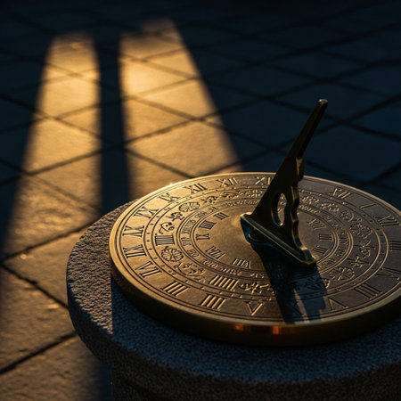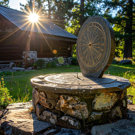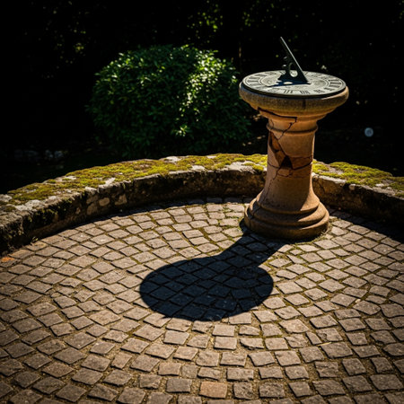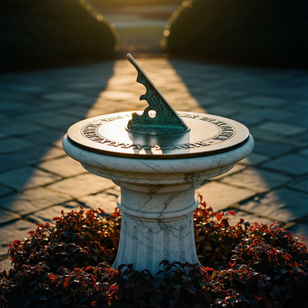 A stunning close-up of a sundial illuminated by the warm glow of sunset, casting intricate shadows on a cobblestone pathway, perfect for outdoor tranquility.