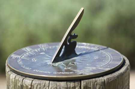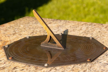 Antique sundial is casting a shadow for telling time on a sunny day in a garden