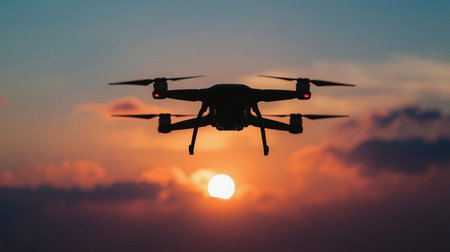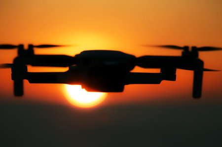 Close up of professional remote control drone flying against dramatic sunset sky background.