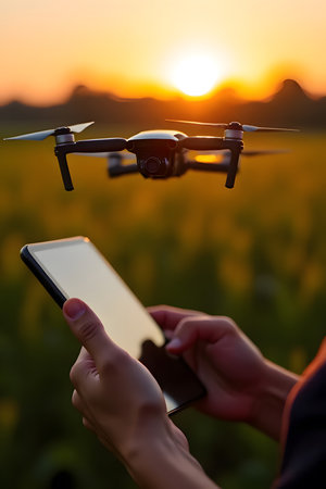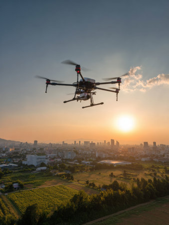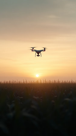 A sleek drone hovers gracefully above vibrant green fields, capturing the golden hues of a stunning sunset. This image showcases the harmony between technology and nature, highlighting the beauty of agricultural landscapes and aerial innovation.