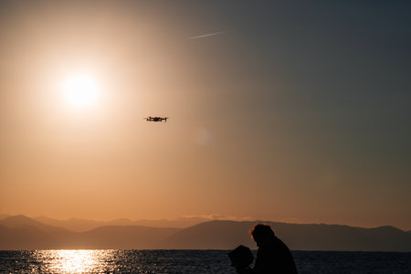 A silhouette of a man flying a drone at dawn, a scenic shot of sunrise over the sea.