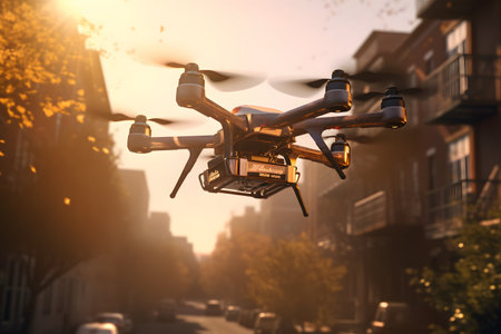 Futuristic drone demonstrating cutting edge innovation, hovering over crowd at outdoor event