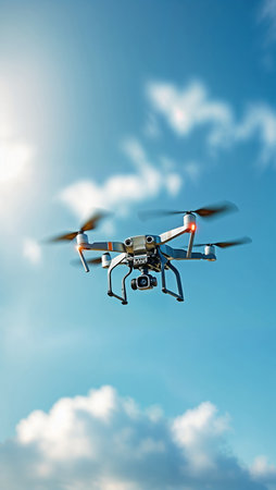 Little gray drone flies in a clear blue sky with fluffy white clouds. Drone is equipped with a camera and has four propellers