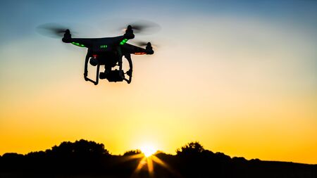 Drone flying in the sky against the backdrop of a bright sunset. Radio-controlled quadcopter with a video camera for observing and filming nature.