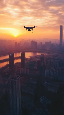 A drone hovers above a sprawling metropolis as a glowing sunset casts a warm light over the city. Skyscrapers reflect colors on the water, creating a captivating urban landscape.
