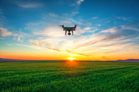 Drone with digital camera flying over corn field at sunset. Drone flying in the sky.