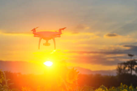 Drone in flight against the background of sunset over a field of sunflowers. Harvesting Sunflower Seeds in agriculture. Copter for photography and video recording.