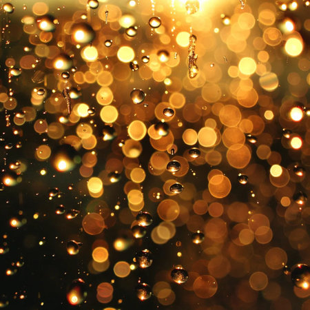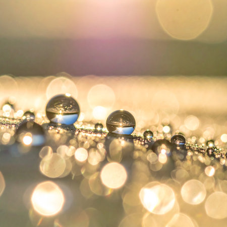 Golden Water Drops on a Reflective Surface, Abstract Macro Photography with Selective Focus