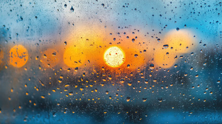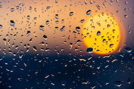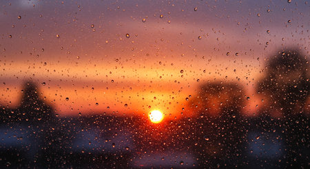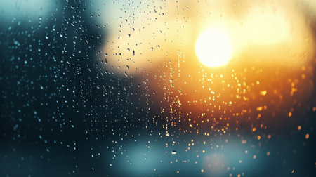 A serene sunset framed by raindrops on a window, depicting a beautiful blend of warm colors and soft focus, perfect for conveying tranquility and nature.