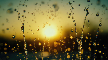 This stunning image captures the moment when sparkling water droplets dance in the air with a vibrant sunset backdrop, creating an enchanting atmosphere.