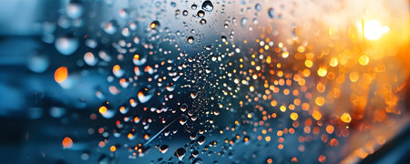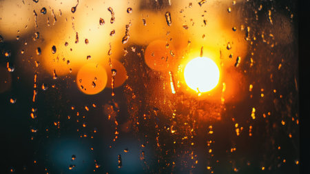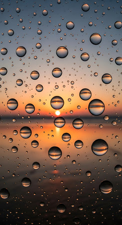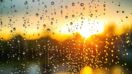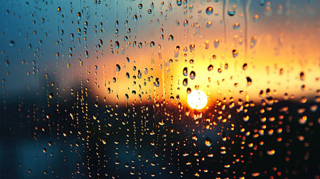 Captured close-up of raindrops on glass during a stunning sunset, showcasing an interplay of light and nature, creating a serene and calming atmosphere.