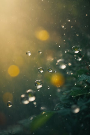 Golden rays penetrate through a mist, illuminating delicate water droplets on a dark surface. The interplay of light and shadow creates an enchanting ambiance, invoking a sense of calm.