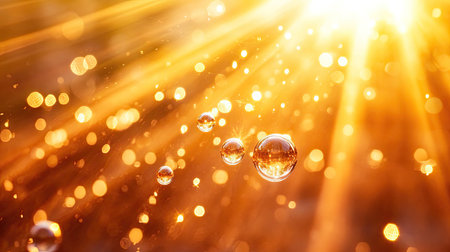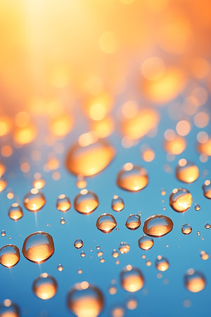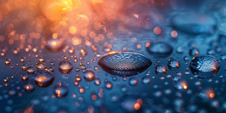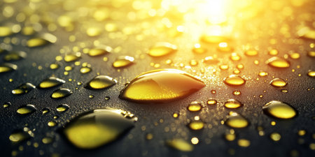 Macro water droplets on a textured surface with a warm golden bokeh. Clear details and vibrant colors enhance...
