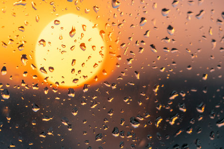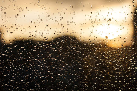 Raindrops on the window against the background of the setting sun. Background with glass and drip texture. High quality photo