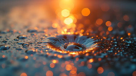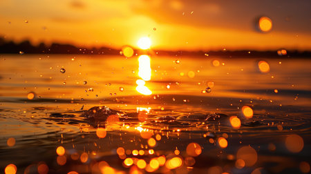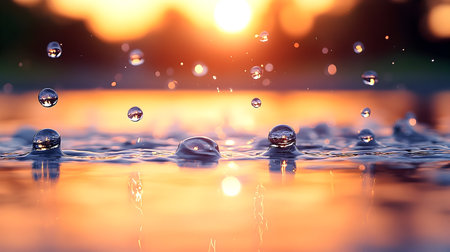 A captivating close-up image featuring sparkling water droplets scattered across a reflective surface, illuminated by the warm, golden light of a setting sun. The blurred background showcases the serene beauty of a sunset over a body of water, with hues of orange and yellow casting a magical glow. The droplets glisten like tiny jewels, capturing the essence of tranquility and natural beauty. Perfect for themes of nature, serenity, water elements, and the magic of golden hour, this image is ideal for wellness projects, environmental campaigns, or artistic backgrounds.