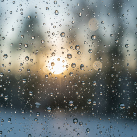 Raindrops on Window Evaporating at Sunrise Symbolizing Fleeting Emotions and Moments